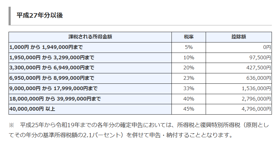 課税所得により異なりますが、1000円以上の課税所得から適用される税金。税率については参考に国税庁の速算表を添付します。